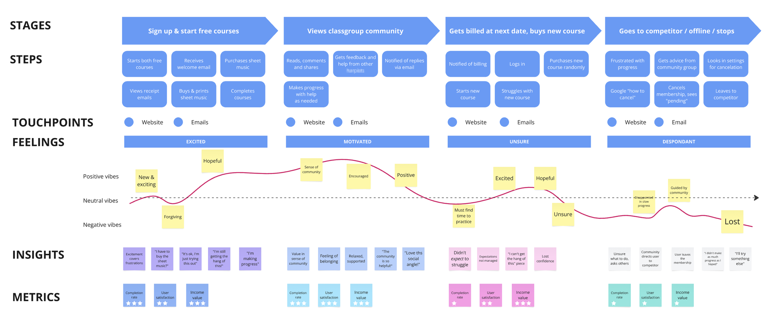 To avoid wasting time with UI designs too early in the process, I stuck with service blueprinting and customer journey mapping (of the customer lifecycle, focusing on the benefits of a clear learning path).