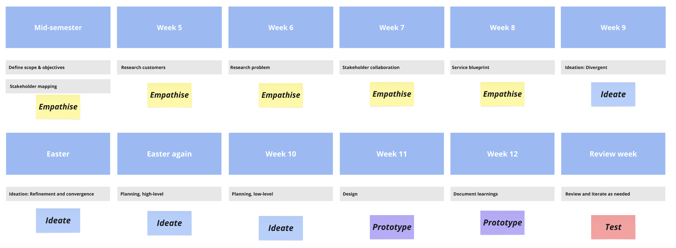 To stay on track, I created a rough project plan with a timeline (based on the design thinking process) and thought about the key actors, possible constraints, where approval would be needed (e.g. data access) and how accountability would be managed.